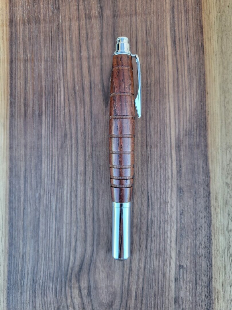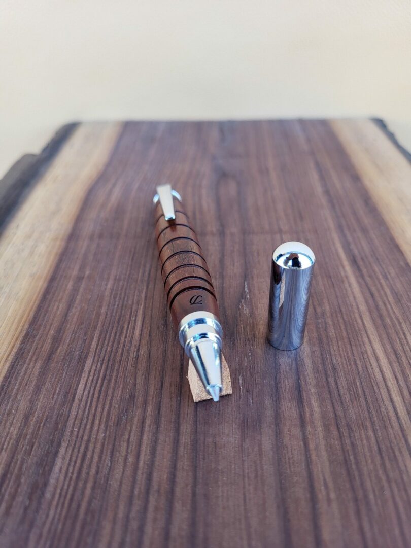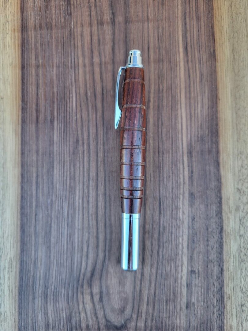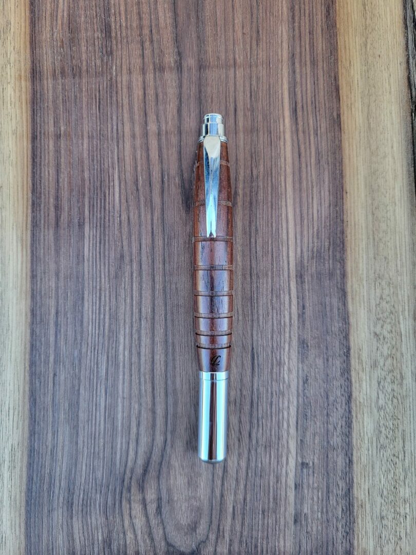 Travailler le cocobolo demande une écoute attentive : ses fibres denses, son grain serré et son huile naturelle révèlent leur beauté uniquement sous une coupe maîtrisée. Le rainurage du corps, réalisé avec minutie, apporte relief et équilibre. Le mécanisme chromé, choisi pour sa fiabilité, s’intègre sans rupture à la silhouette de l’objet.