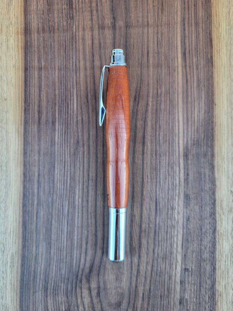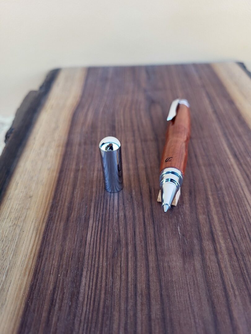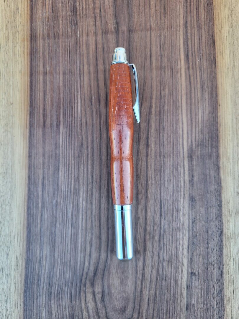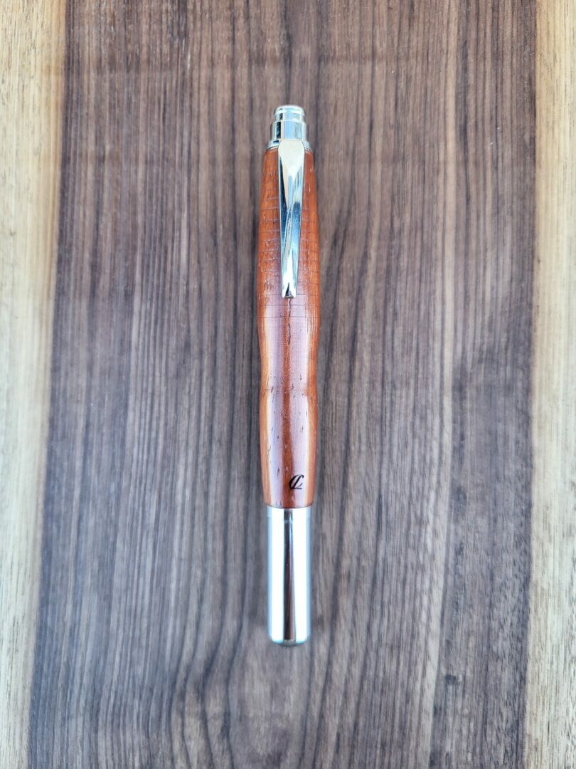 Ce roller est tourné dans un bois de padouk, apprécié pour sa couleur chaude et son veinage naturel. La partie supérieure du corps est très finement rainurée, apportant une texture délicate presque imperceptible au toucher mais visuellement élégante. Le mécanisme finition chrome souligne avec sobriété les lignes du stylo.