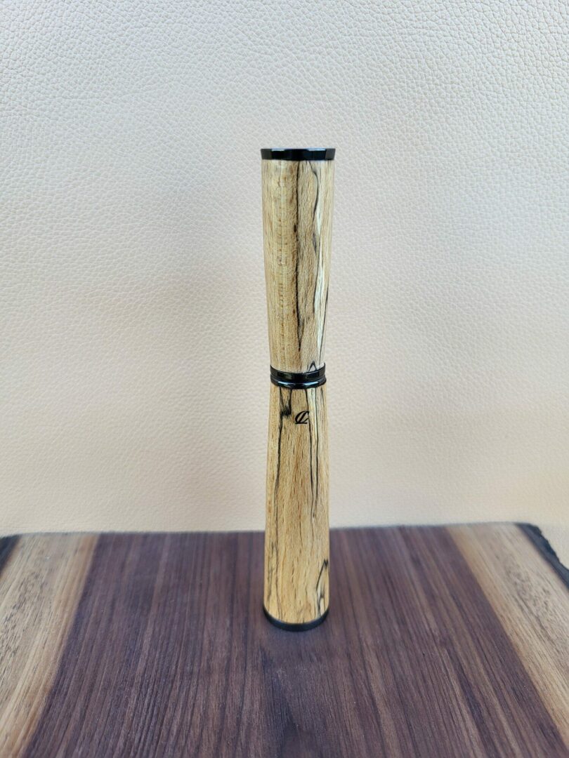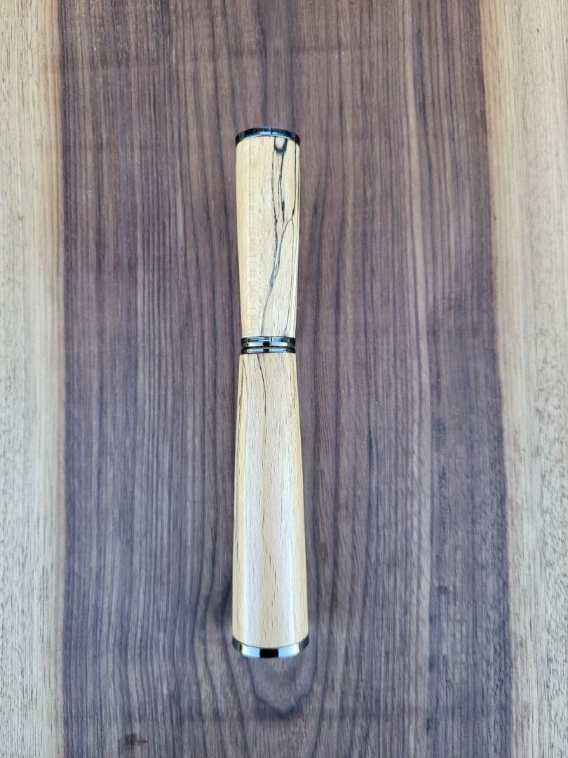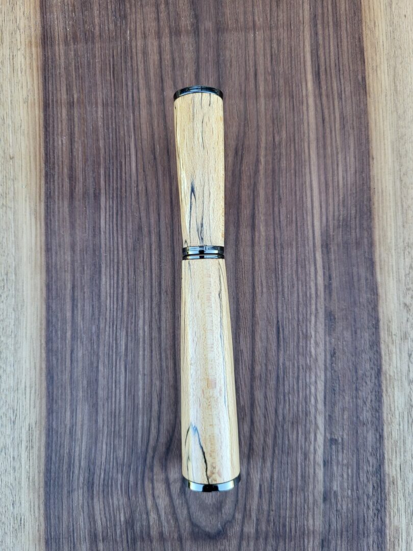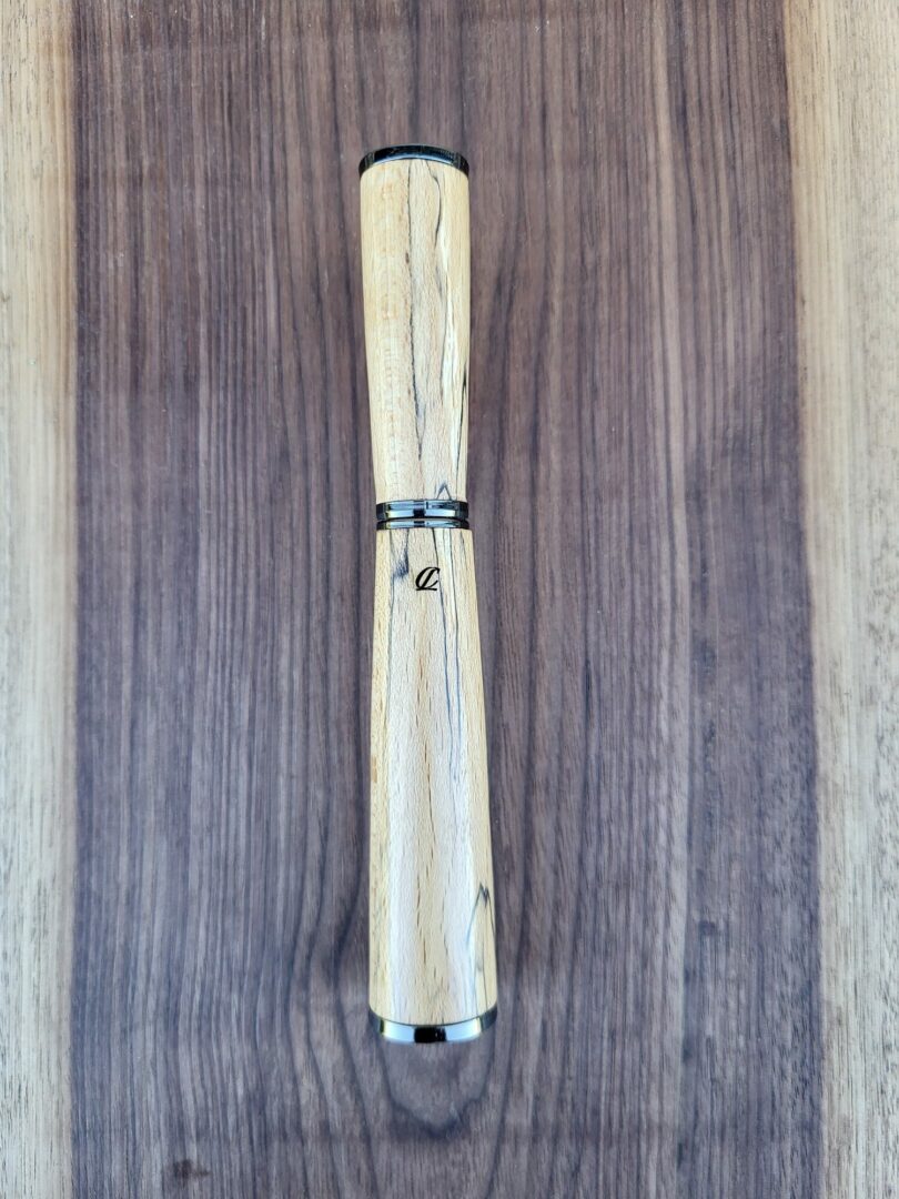 Ce stylo est tourné à la main dans du hêtre échauffé, un bois dont les motifs singuliers proviennent de la transformation naturelle du bois. Les lignes sombres et irrégulières qui parcourent la matière créent un dessin unique, presque graphique, contrastant avec les tonalités blondes et chaleureuses du hêtre. Finition gun.