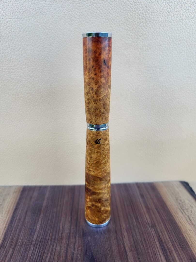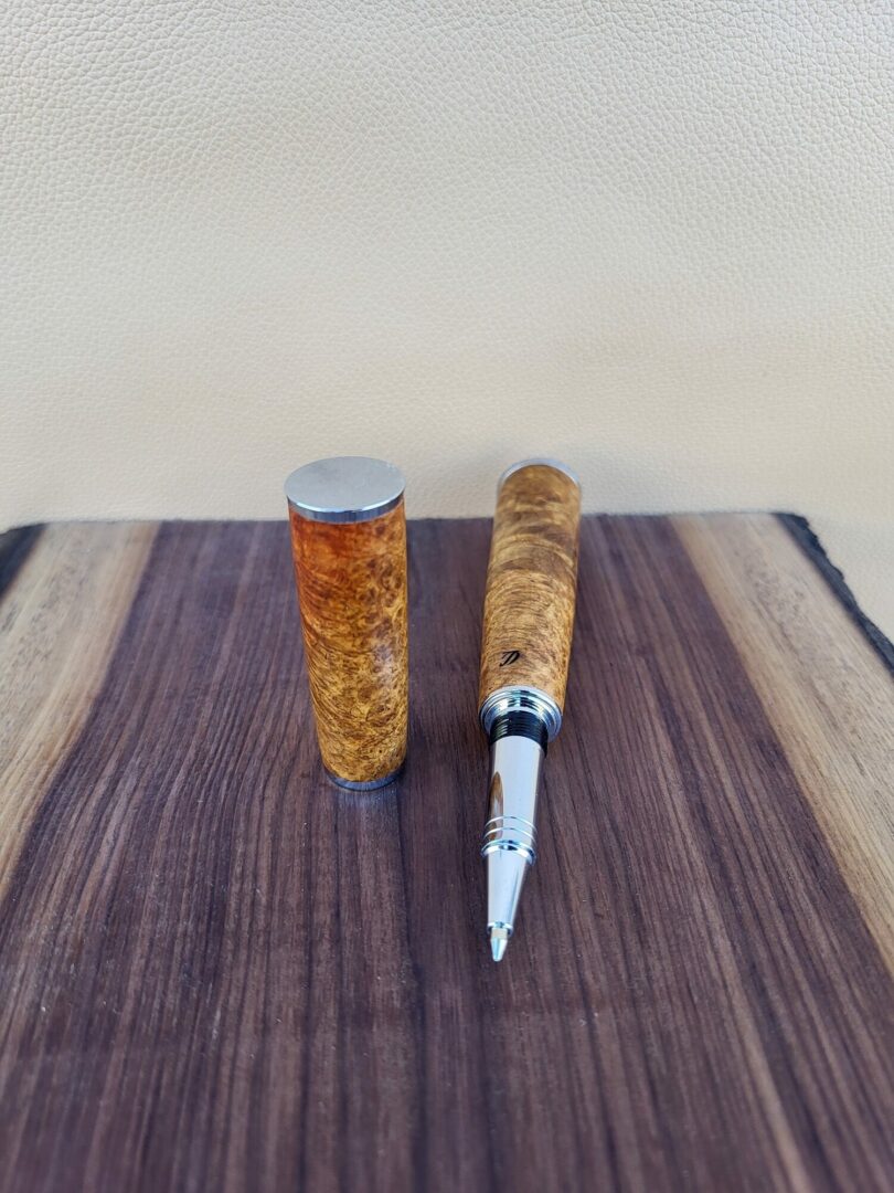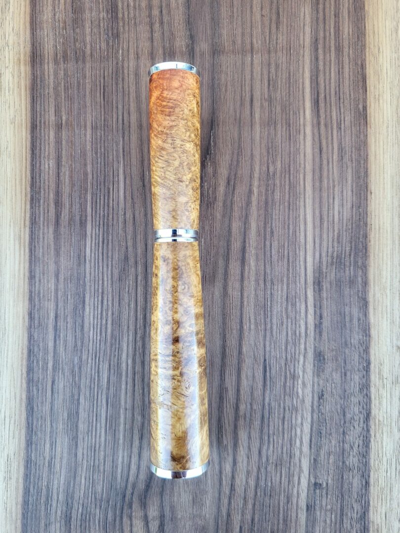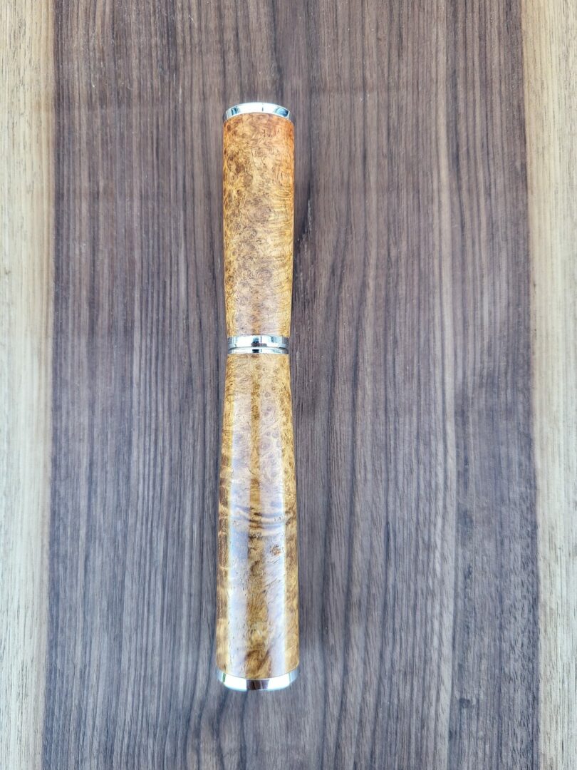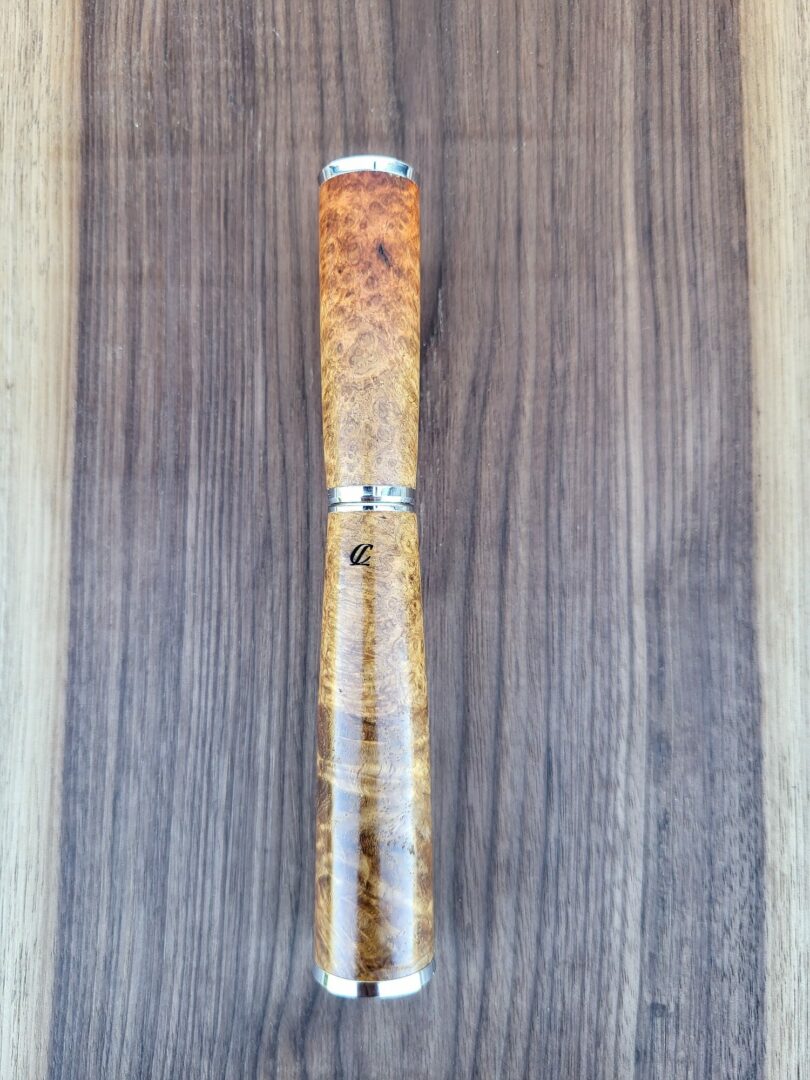 Ce stylo est tourné à la main dans une loupe d’amboine, un bois recherché pour ses motifs tourbillonnants et ses nuances riches allant du brun doré aux teintes plus profondes. La structure particulière de la loupe révèle un dessin du bois dense et vivant qui rend chaque pièce unique. Finition chromée.