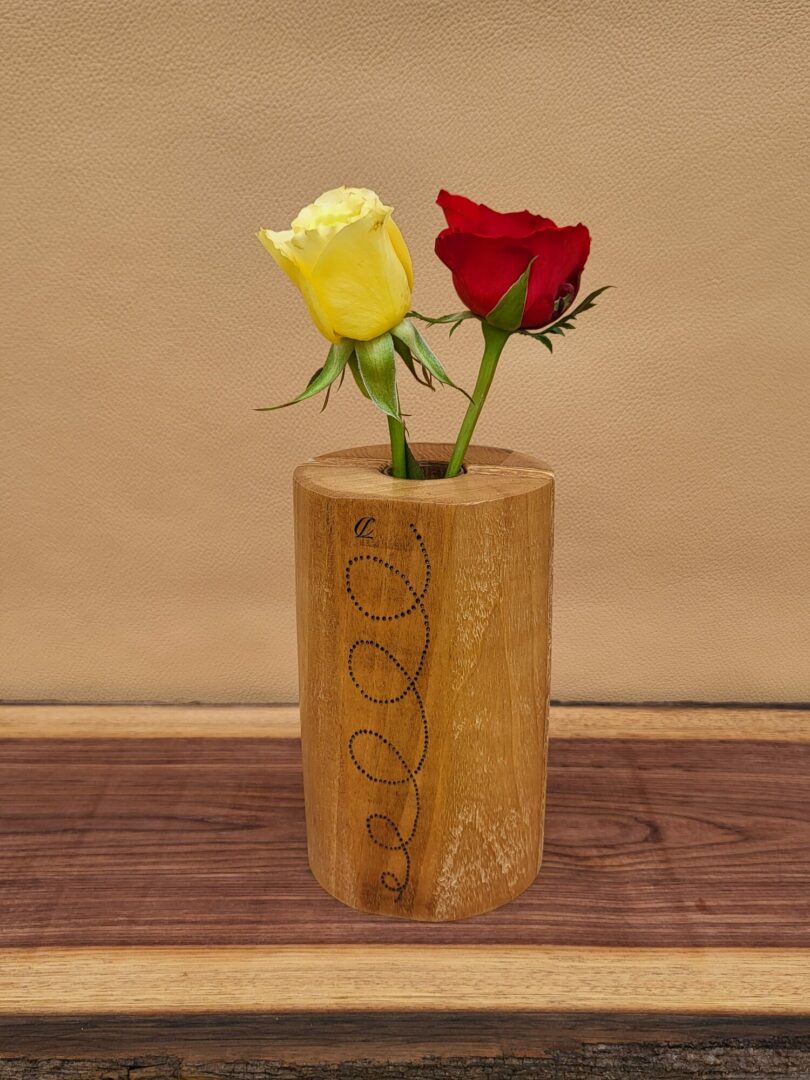 La forme conserve une base cylindrique, mais laisse apparaître une face volontairement plane. C’est sur cette surface que la pyrogravure vient s’exprimer : un motif délicat, tracé à la main, qui contraste avec la densité du bois. Le geste est visible, assumé, et donne à la pièce une dimension presque graphique.