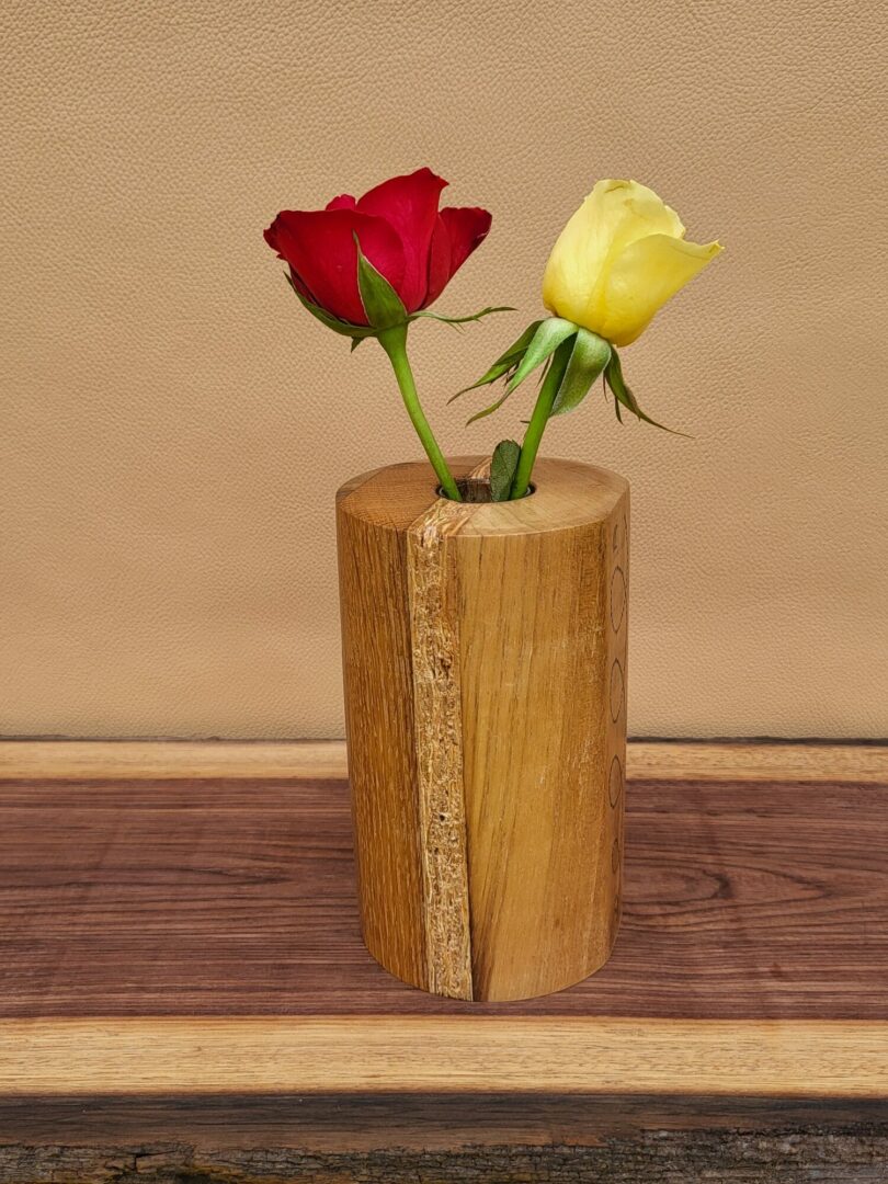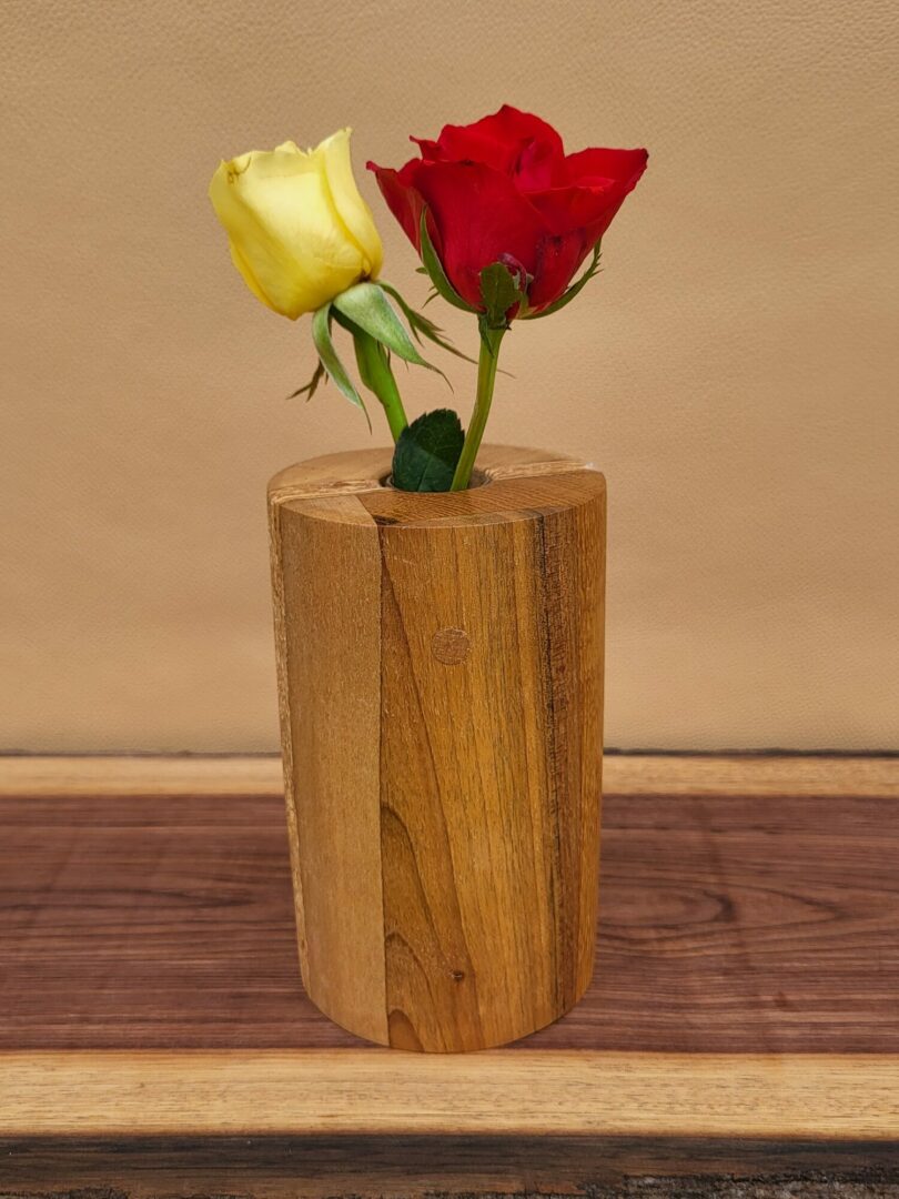 Ce soliflore joue sur les contrastes. Le noyer apporte sa profondeur sombre, le chêne sa clarté structurée, et l’OSB une texture plus brute, presque inattendue. L’ensemble compose une pièce vivante, où chaque essence dialogue avec les autres sans chercher à s’effacer.