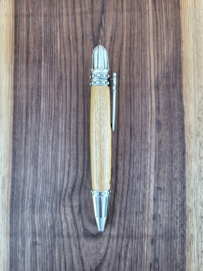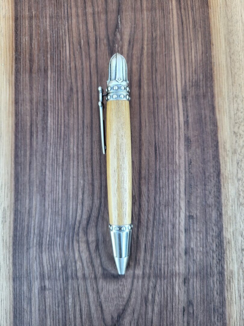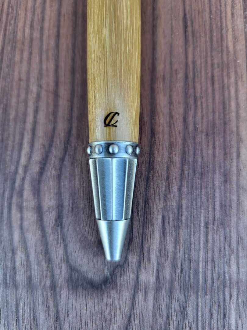 Ce modèle est tourné dans un bois naturel au veinage fin, dont les nuances blondes et les lignes sombres révèlent la beauté du matériau. L’essence exacte n’étant pas identifiée, c’est avant tout le dessin du bois et son caractère qui ont guidé sa transformation en instrument d’écriture.