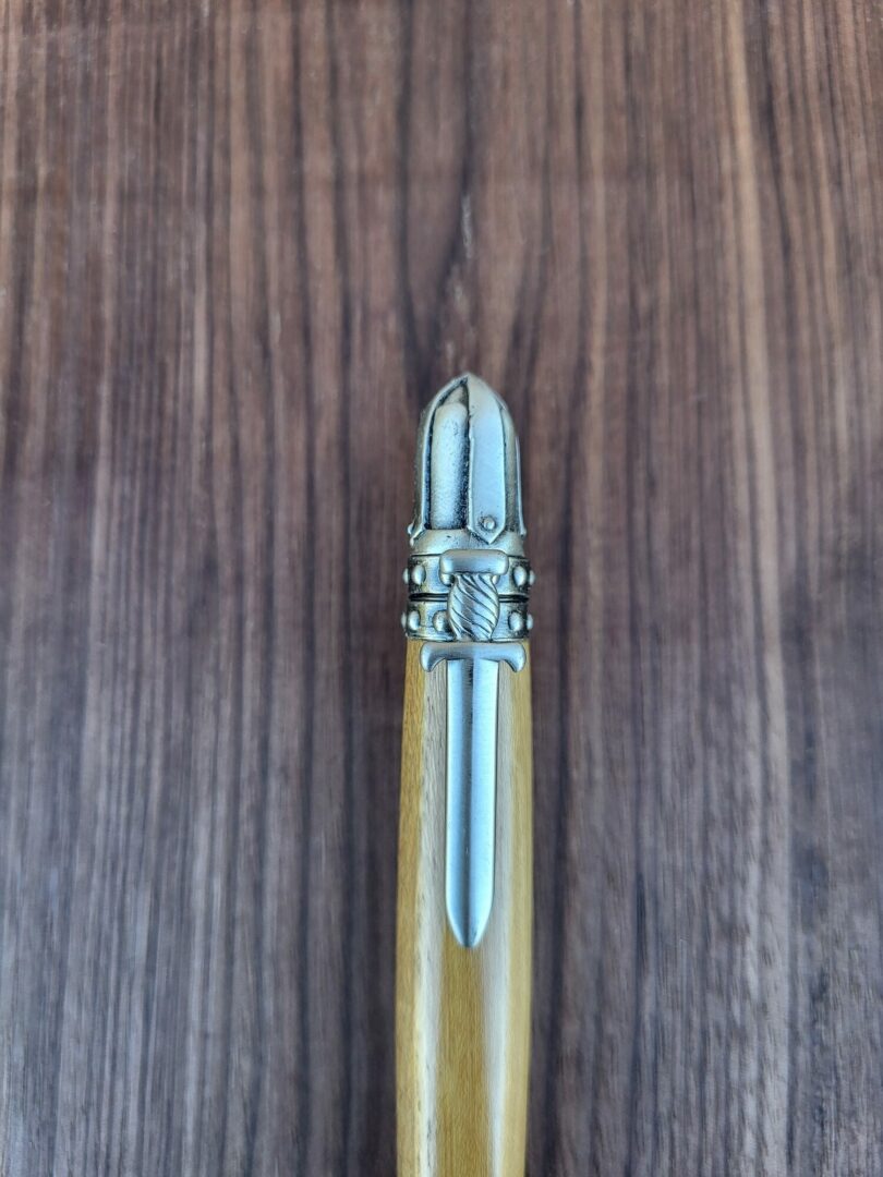 Les éléments métalliques à finition antique apportent une identité forte au stylo : bagues décoratives, clip travaillé et sommet sculpté évoquent l’esthétique d’objets anciens. Cette combinaison entre bois naturel et métal patiné crée un objet à la fois sobre et expressif.