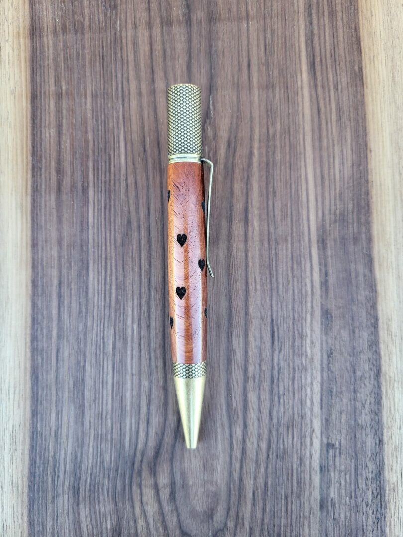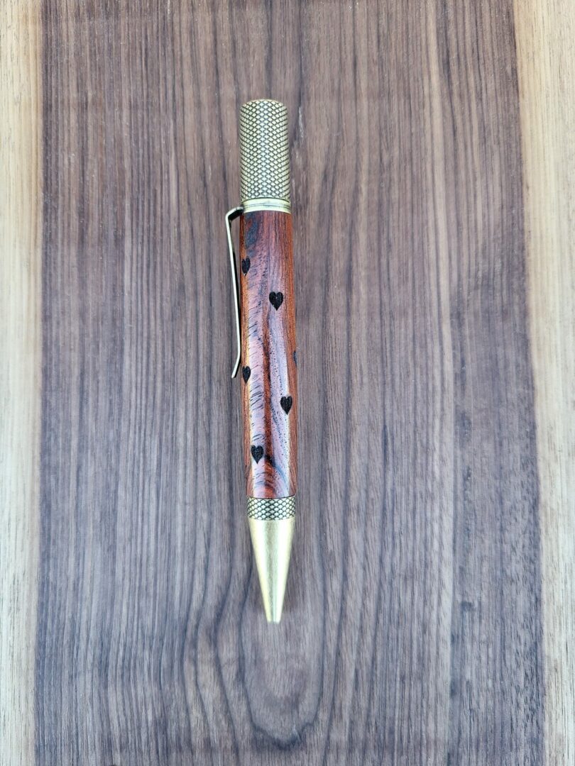 Le narra rouge, aussi appelé amboine, se distingue par un veinage riche et profondément chatoyant. Ses nuances oscillent entre des rouges chauds, des bruns dorés et des zones plus sombres, créant un jeu de lumière vivant à chaque mouvement. La finition satinée révèle cette complexité sans l’écraser. Les cœurs gravés, disposés librement, viennent ponctuer cette surface vibrante avec une présence discrète mais expressive.