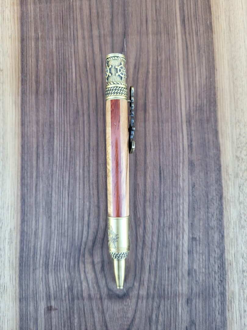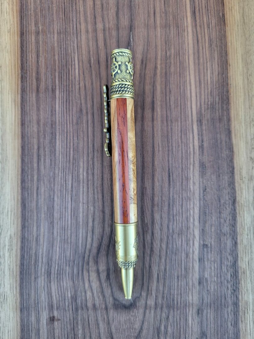 Le corps du stylo est tourné à partir d’un assemblage de pin géant des Philippines, de padouk et de loupe de frêne, trois bois aux caractères distincts qui se complètent harmonieusement. Les variations de teinte, les nuances naturelles et les motifs du bois créent un contraste subtil et vivant, faisant de chaque stylo une pièce unique.