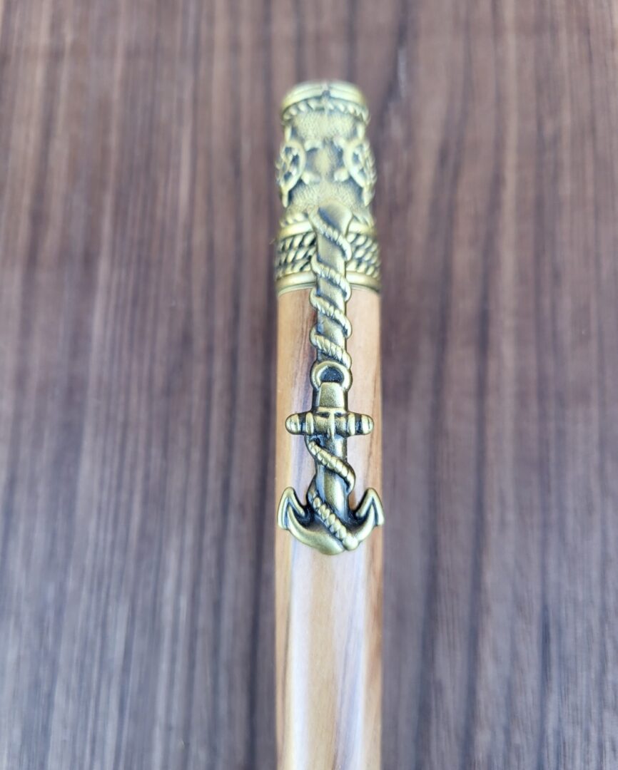 le sommet du stylo présente une rose des vents indiquant nord, sud, est et ouest, évoquant la boussole des navigateurs.