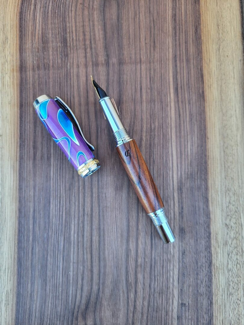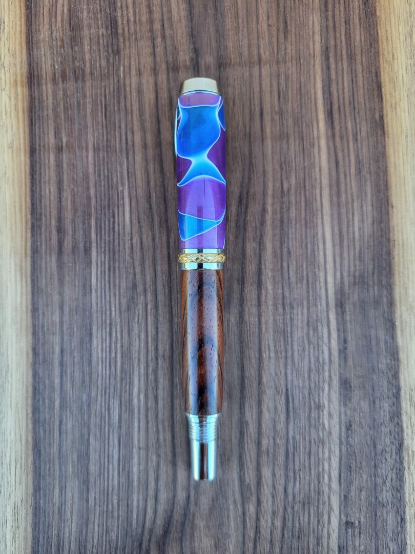 – un capuchon en résine artisanale, aux tons mauves et bleus séparés par une fine ligne blanche, créant des motifs fluides et irréguliers uniques ;