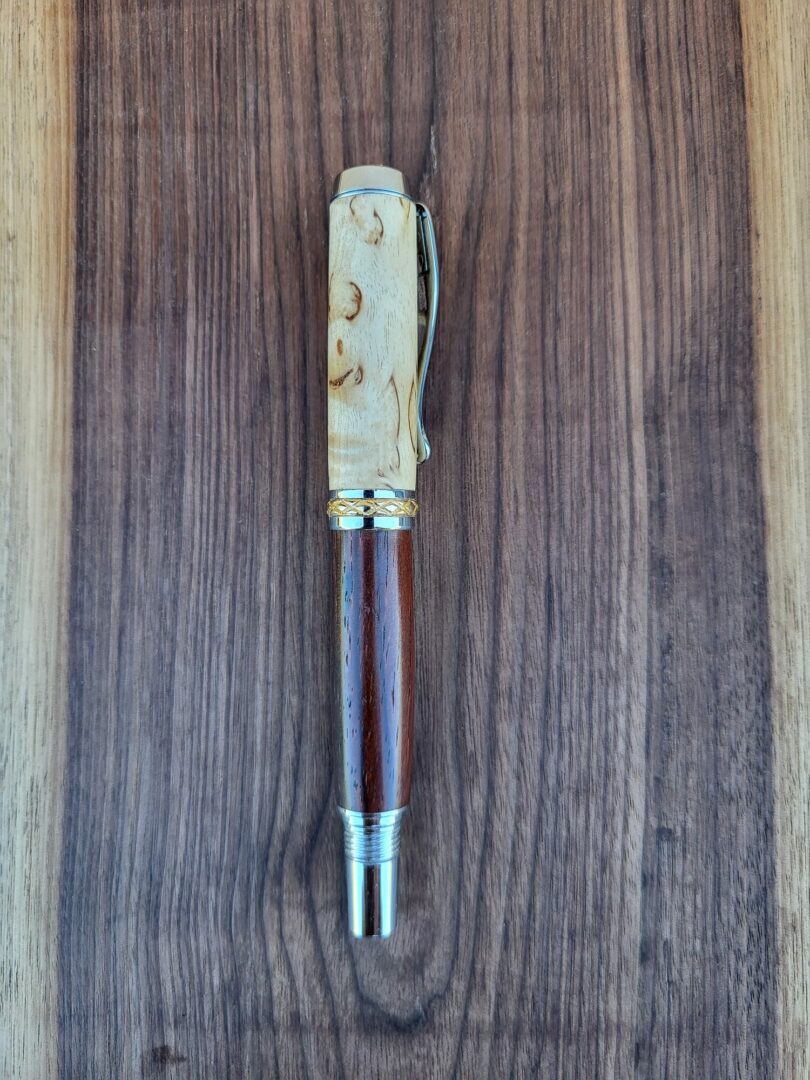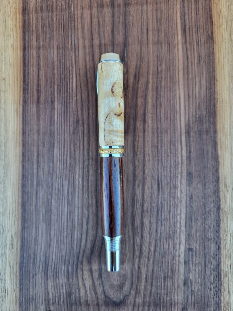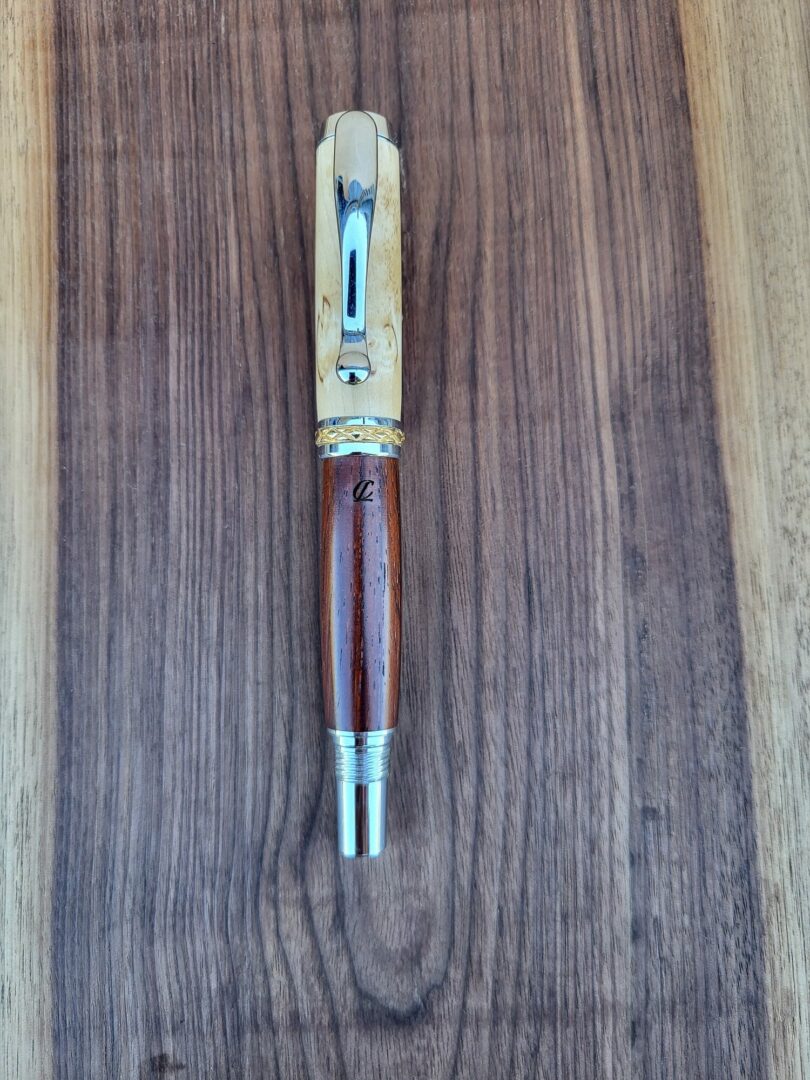 Le capuchon en bouleau madré de Carélie présente un miroitement unique, avec des motifs irréguliers qui jouent avec la lumière et confèrent à chaque exemplaire sa propre identité visuelle. Le corps en cocobolo offre un contraste chaleureux : veinage serré, nuances profondes, présence noble et naturelle.