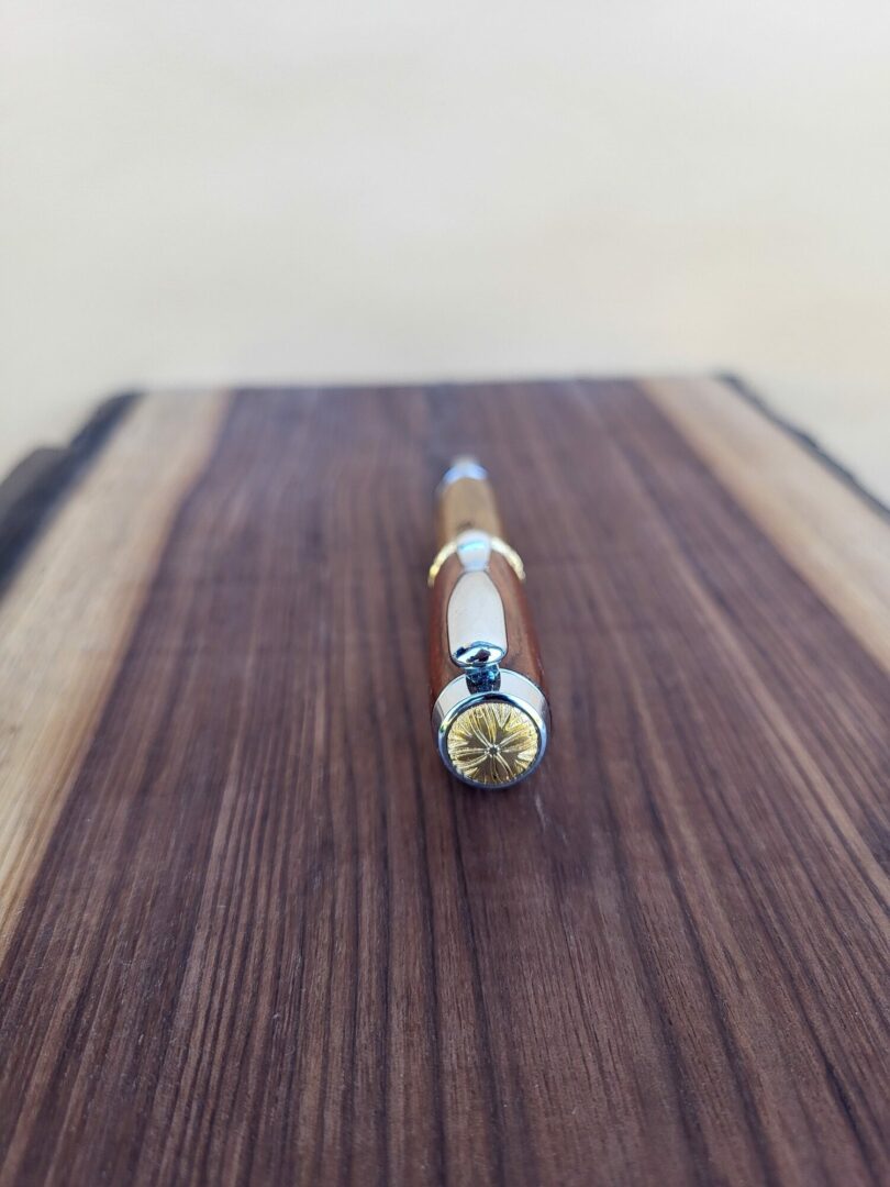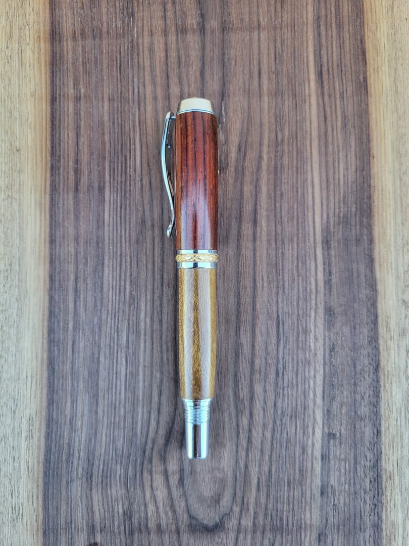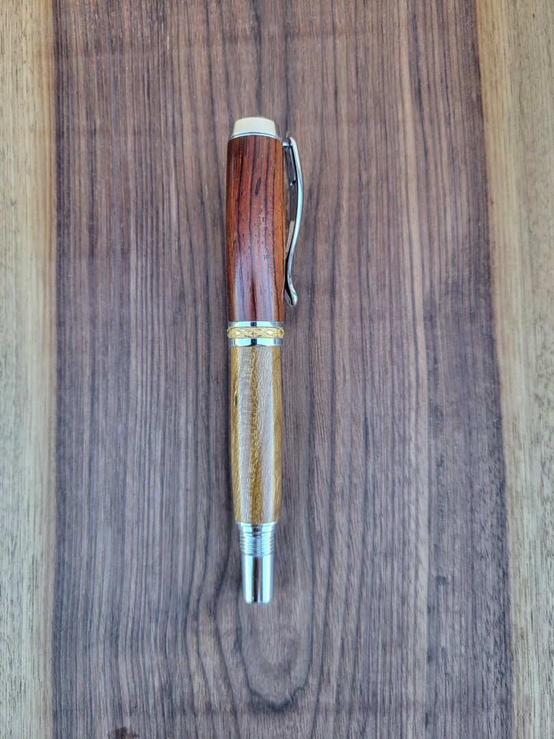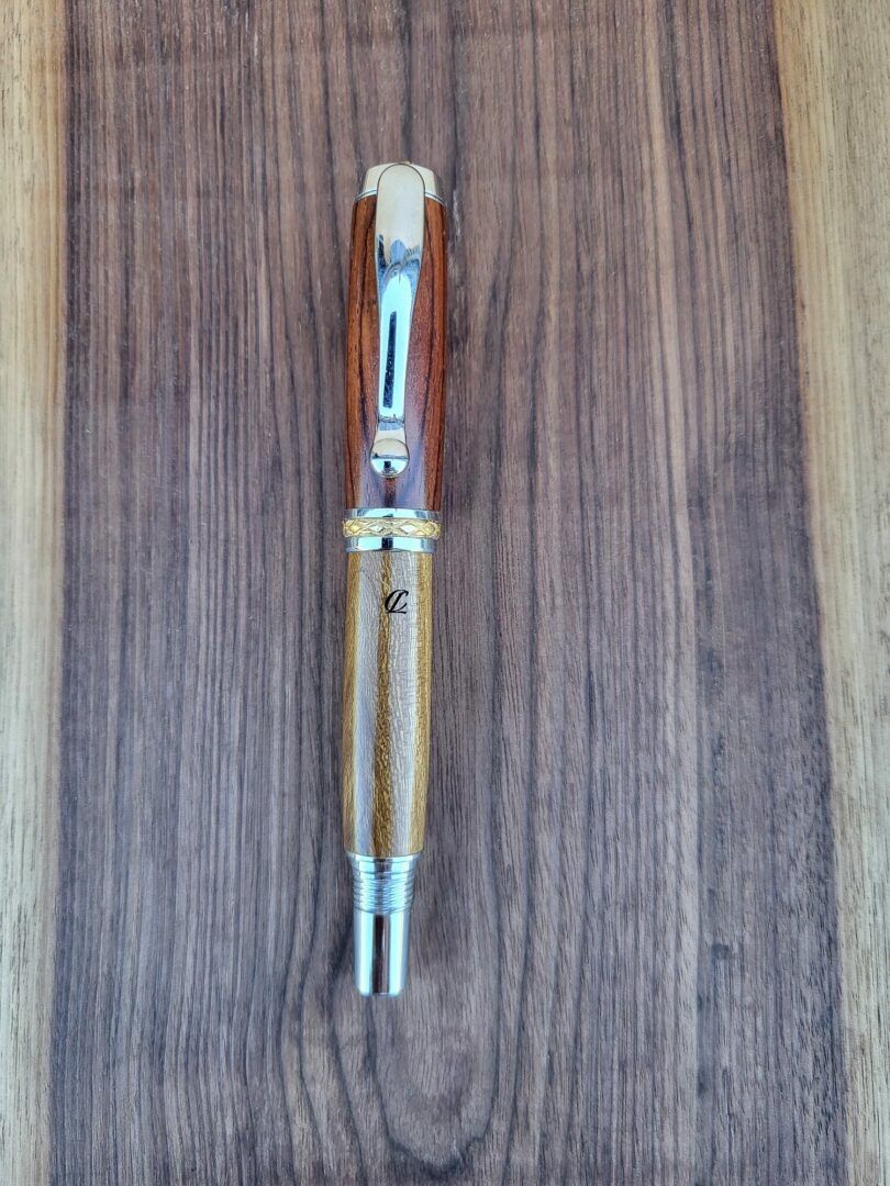 Ce stylo-plume Barbadás marie deux essences complémentaires : le cocobolo, dense et sombre, aux veinages sinueux et contrastés, et le cytise, plus clair, lumineux et délicatement nervuré. La rencontre de ces deux bois crée un stylo-plume élégant, chaleureux et visuellement équilibré, où chaque détail attire le regard.