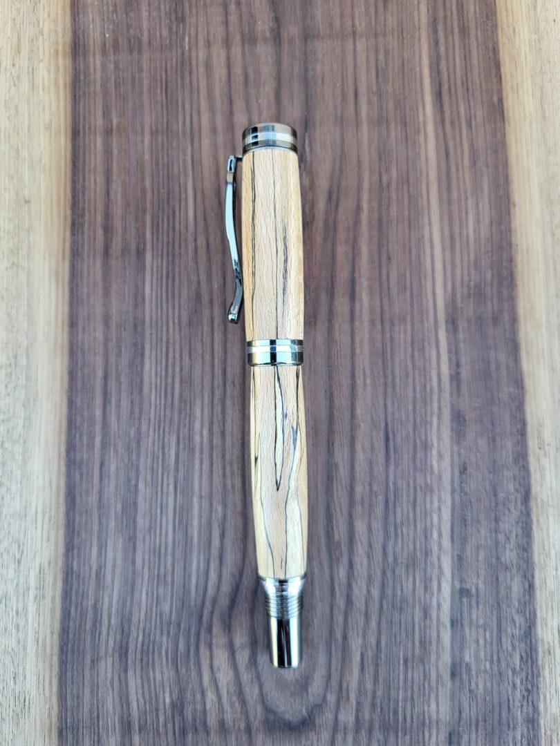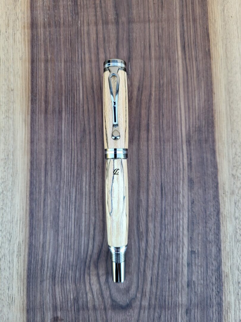Dans cette version, le stylo est réalisé en hêtre échauffé, un bois dont l’apparence est marquée par des lignes sombres et sinueuses formées naturellement dans le bois. Ces dessins, souvent comparés à de l’encre qui aurait traversé la fibre du bois, donnent à chaque pièce un caractère graphique très particulier.
