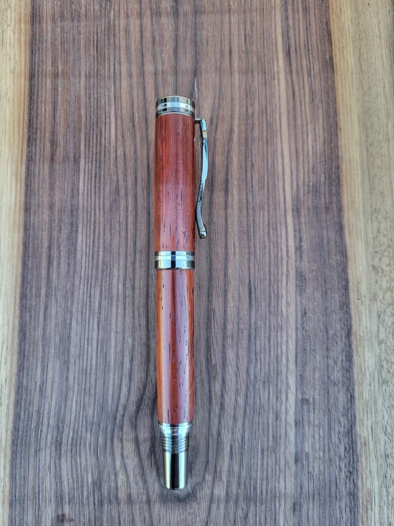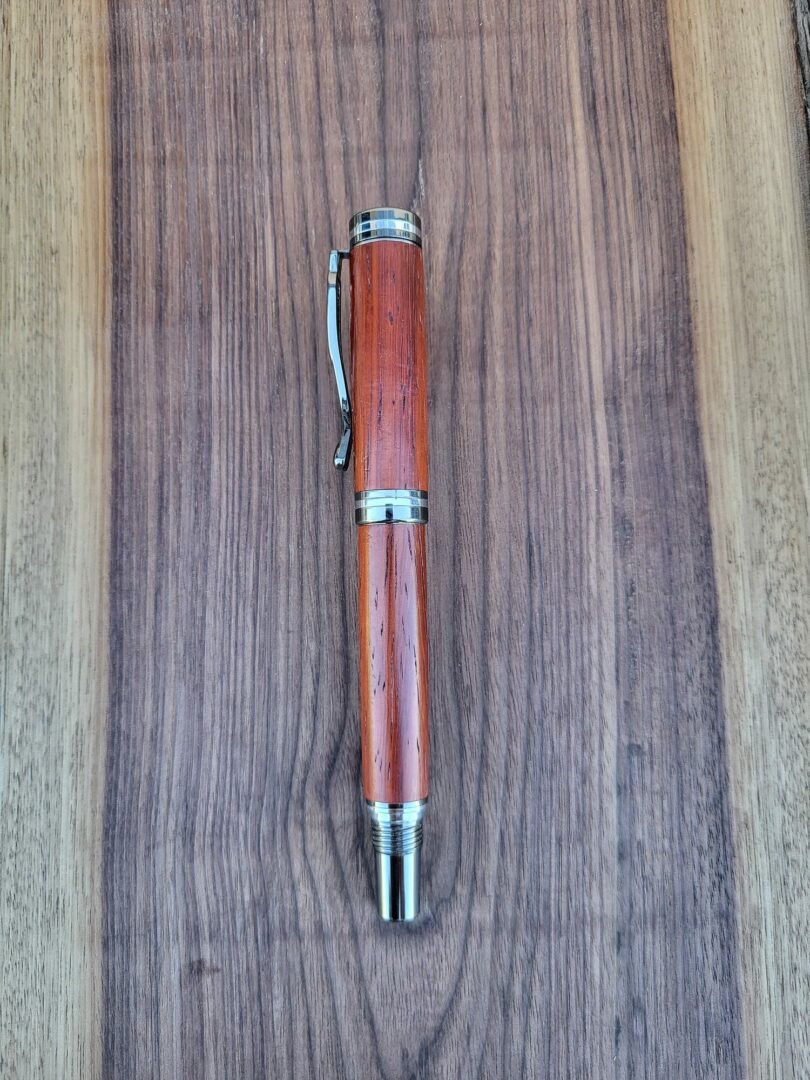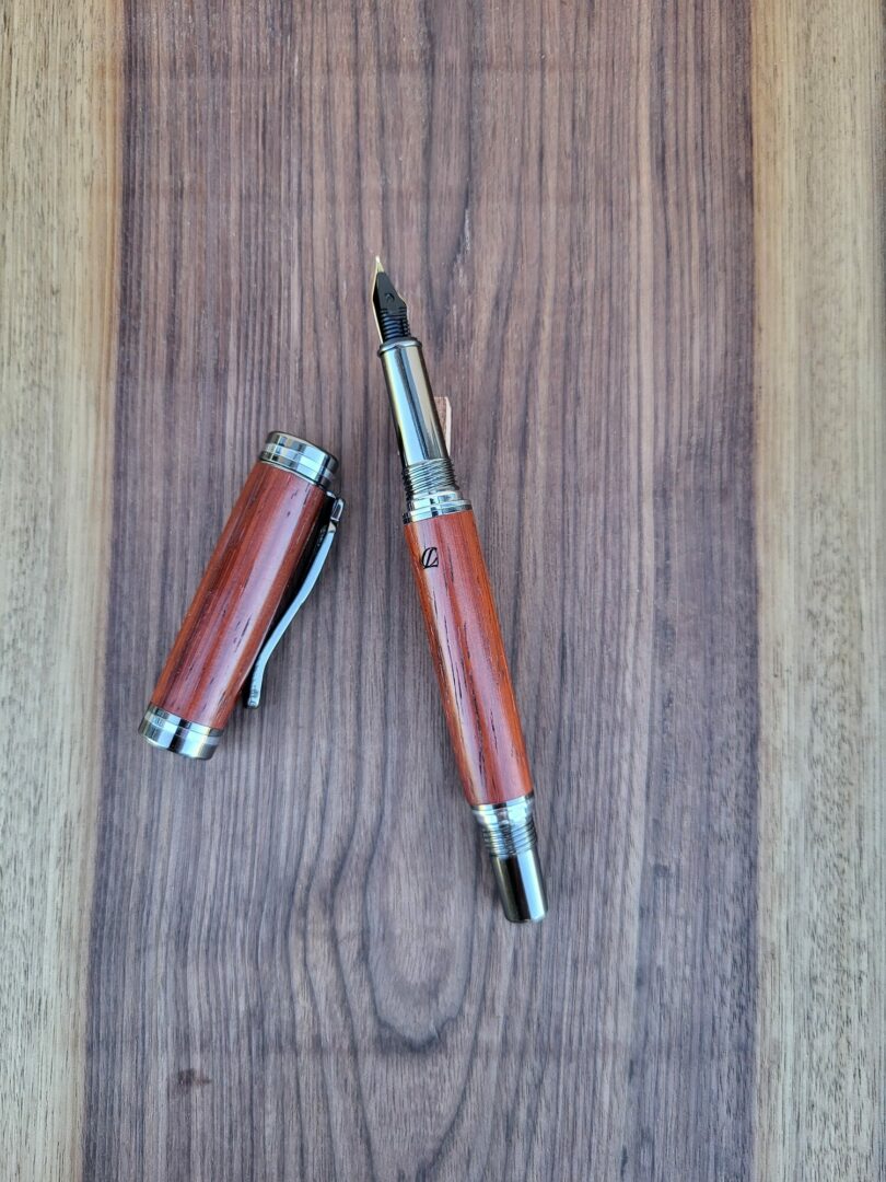 Dans cette version, le stylo est réalisé en padouk, un bois exotique apprécié pour sa couleur rouge intense et lumineuse. Selon la lumière et la finition, ses nuances peuvent varier du rouge orangé au brun rouge profond, offrant une richesse visuelle remarquable.